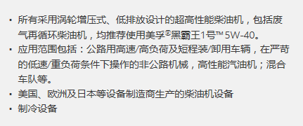 現代的高輸出、低排放柴油發動機產生的煙灰較多,操作溫度也比款式較老的自然吸氣發動機要高,因而對高性能發動機機油的要求顯著提高了。流行的設計緊湊的發動機減少了機油的消耗,因而缺乏新油補充消耗掉的添加劑。此外,頂端活塞環位置較高,油膜較接近高溫的燃燒室,機油所承受的熱應力也相應提高。提高燃油噴射壓力及延滯噴射周期可有效地控制廢氣的排放,但也提高了廢氣再循環式發動機的操作溫度和煙灰量。美孚?黑霸王1號? 5W-40 在高溫下仍能提供卓越的潤滑效果。本品也與傳統的機油完全相容。主要優越性如下: